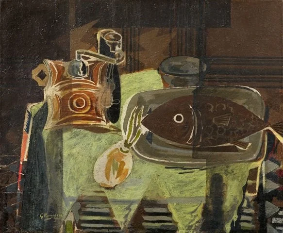 The theme of fish within still life paintings recurs regularly in Georges Braque’s oeuvre, be it with La carafe et les poissons (1941), Les poissons noirs (1942) or even Les deux rougets (1940–1941).