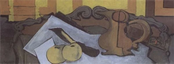 The painting’s look is largely a product of its two-dimensionality; all the elements of this composition emphasise its front-facing nature, owing to the almost overpowering presence of a dark blue and brown-beige background. That background is covered in decorative shapes that come across as geometric and lacking in depth. The objects – that is: the napkin, the table and the teapot – are seized upon by the background, meaning that they do not necessarily grab the viewer’s attention immediately. In Classical or Academic art, objects are represented very clearly against a background. In this work, by contrast, the background comes forward and itself dulls the visibility of the objects. The two parts of the work – ‘figures’ and background – are no longer meaningfully separated, instead seeming to be morphed together. The background, with its decorative marks, becomes a central part of this work, pervading the space inhabited by the figures. Georges Braque signals a clean break from the usual order of things in painting: no longer do the objects dominate over the background, but it is the decorative background itself which becomes the painting’s real theme.